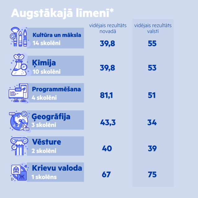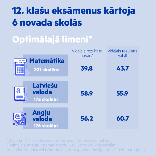 12. klases eksāmeni – Arī šajā gadā 12. klašu skolēni eksāmenus kārtoja divos līmeņos – optimālajā (pamatlīmenis) un augstākajā (padziļinātais profils).