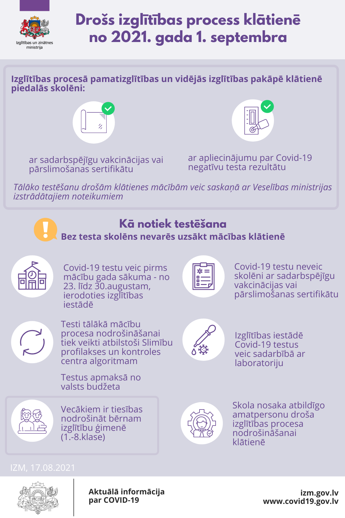Sākoties mācību gadam, mācībās klātienē varēs piedalīties tikai tie skolēni, kuriem būs vakcinācijas vai pārslimošanas sertifikāts vai negatīvs Covid-19 testa rezultāts. Bez testēšana, skolēns nevarēs nedz uzsākt, nedz arī turpināt mācības klātienē. Ja skolēns netiks testēts, tad pamatizglītības ieguve skolēniem no 1.-8.klasei būs vecāku atbildība un tā iegūstama ģimenē. Testēšana ar siekalu testu skolās tiks veikta arī mācību gada laikā, atbilstoši Slimības un profilakses kontroles centra algoritmam.