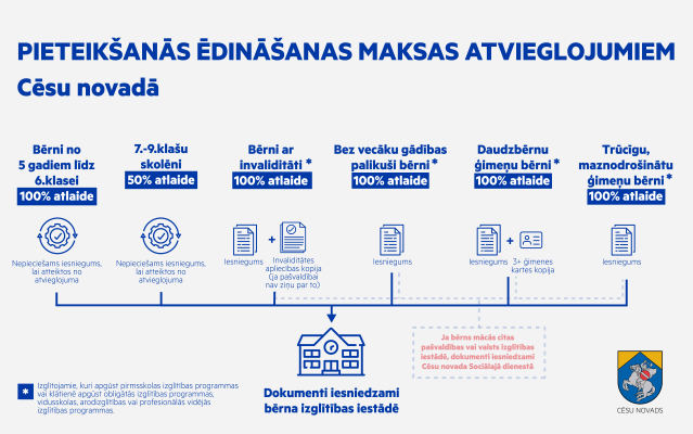 Lai saņemtu atvieglojumus, vecākiem vai aizbildņiem jāiesniedz iesniegums bērna izglītības iestādē vai Cēsu novada Sociālajā dienestā.