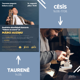Ceturtdien, 14. augustā, plkst. 19.00 Taurenes pagasta Dabaru ezerā izskanēs saulrieta akustiskais koncerts “Vakars uz ezera” ar Mārci Auziņu. Ierašanās no plkst. 18.30. Aicinām ņemt līdzi savus krēslus, pledus un citus sēžamos, kā arī laivas un SUP dēļus, lai koncertu baudītu uz ūdens.