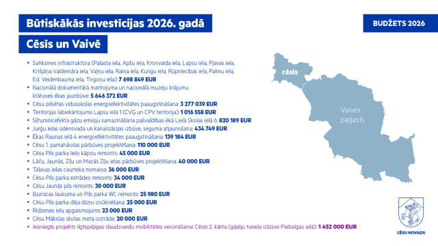2026. gadā Cēsīs plānotas vairākas nozīmīgas investīcijas, kuru mērķis ir uzlabot pilsētvidi, kultūras infrastruktūru un iedzīvotājiem pieejamos pakalpojumus. Lielākais finansējums paredzēts satiksmes infrastruktūras sakārtošanai, kur plānotie ieguldījumi pārsniedz 7,6 miljonus eiro. Šajā programmā ietilpst vairāku ielu un posmu pārbūve un seguma atjaunošana, kas uzlabos satiksmes drošību un mobilitāti pilsētā. Apjomīgs finansējums – vairāk nekā 5,6 miljoni eiro – novirzīts Nacionālā muzeju krātuvju kompleksa ēkas būvniecībai, tādējādi veicinot kultūras mantojuma saglabāšanu un pieejamību.