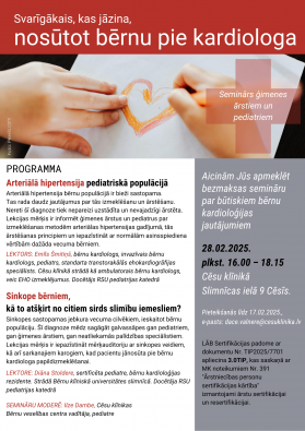 Aicinām ģimenes ārstus un pediatrus pieteikties aktuālam semināram, kas notiks Cēsu klīnikā 28. februārī plkst. 16.00 - 18.15 par bērnu kardioloģijas jautājumiem "Svarīgākais, kas jāzina, nosūtot bērnu pie kardiologa"!
