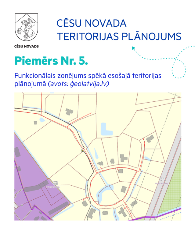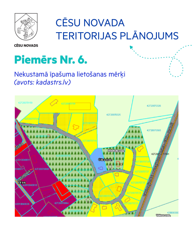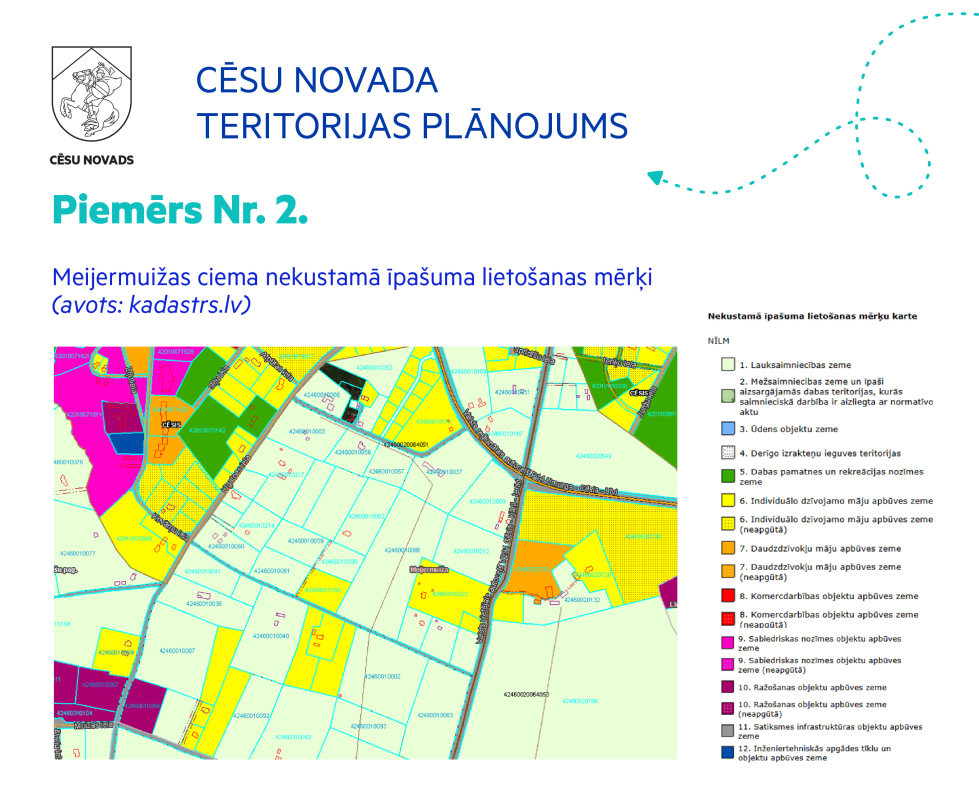 Otrajā piemērā redzams, ka lietošanas mērķi nav noteikti vienmērīgi – tikai dažās atsevišķās vietās apbūvētām zemes vienībām tie ir noteikti kā individuālo dzīvojamo māju apbūves zeme.