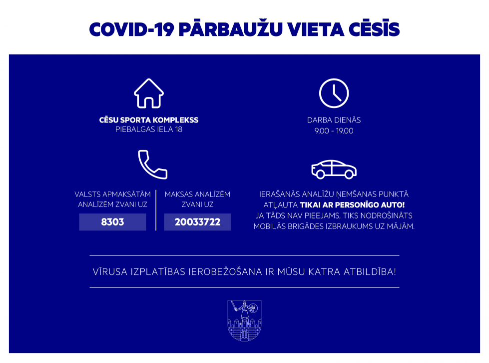 Papildu prevencijas nodrošināšanai analīžu veikšanai Cēsīs, Cēsu sporta kompleksā Piebalgas ielā 18 no 27.marta plkst.13 tiks atvērts Covid-19 analīžu pieņemšanas punkts.