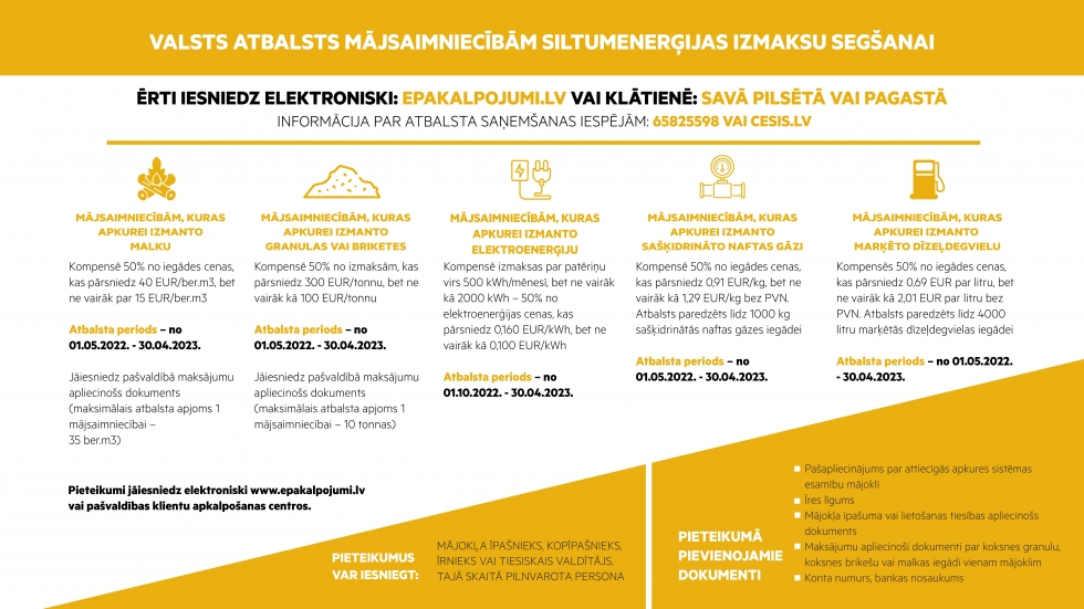 Turpinās iesniegumu pieņemšana par apkurei iegādāto malku, koksnes granulām, briketēm un elektroenerģiju. Savukārt centralizēti piegādātās apkures lietotājiem valsts atbalsts tiek automātiski piemērots rēķinos. Automātiski atbalsts tiek piemērots arī dabasgāzes patērētājiem.