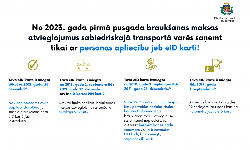 Plānots, ka 2023.gada 1.pusgada laikā tiks īstenota jauna kārtība braukšanas maksas atvieglojumu saņemšanai sabiedriskajā transportā - starppilsētu un vietējās nozīmes autobusos un vilcienos. Turpmāk atvieglojumu varēs saņemt tikai ar personu apliecību (eID karti), kas papildināta ar speciālu funkcionalitāti (lietotni). Atvieglojumu varēs saņemt uzreiz pie transportlīdzekļa vadītāja autobusā vai kontroliera vilcienā, tāpat arī iegādājoties biļeti biļešu tirdzniecības kasē vai internetā.