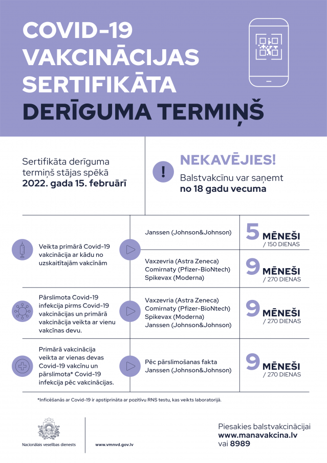 Omikrona varianta straujās izplatības dēļ un, lai mazinātu plašas COVD-19 infekcijas izplatību, Latvijā ir noteikts primārās vakcinācijas sertifikāta derīguma termiņš. Valdība 6. janvārī apstiprināja grozījumus Ministru kabineta noteikumos, nosakot, ka Covid-19 vakcinācijas sertifikātu derīguma termiņš Latvijā stāsies spēkā 15.februārī un attieksies uz pakalpojumu saņemšanu un pasākumu apmeklēšanu epidemioloģiski drošā vidē, kur nepieciešams uzrādīt sadarbspējīgu vakcinācijas sertifikātu. Vakcinācijas derīguma termiņš netiek attiecināts uz personām līdz 18 gadiem, jo šai iedzīvotāju grupai balstvakcinācija pašlaik nav nepieciešama. Darba pienākumu veikšanai joprojām saglabājas prasība pēc pabeigtas primārās vakcinācijas un balstvakcinācija tiek stingri rekomendēta.