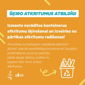 Aicinām izmantot norādītos konteinerus atkritumu šķirošanai un sekot norādēm uz atkritumu urnām. Atcerieties, ka bioloģiski noārdāmie atkritumi jāizmet speciāli paredzētajos konteineros.