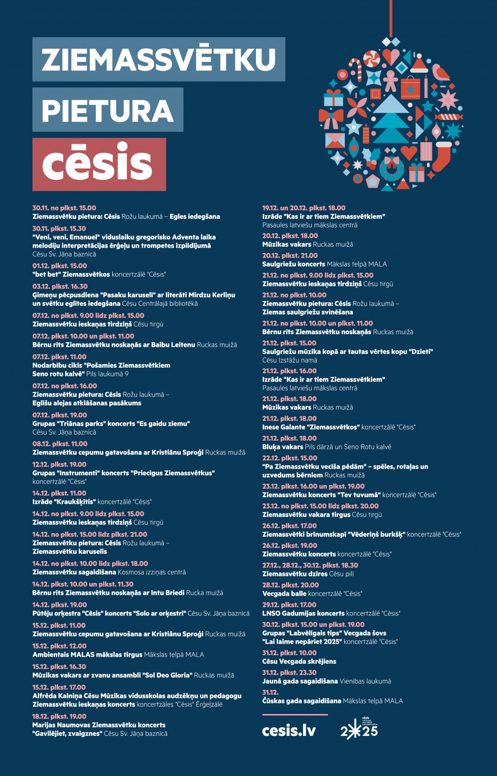 Ziemassvētku gaidīšanas laikā aicinām cēsniekus un pilsētas viesus baudīt plašu svētku pasākumu programmu "Ziemassvētku pietura – Cēsis". Tradicionāli Ziemassvētku sajūtu Cēsīs veidos tirdziņi, koncerti, aktivitātes lieliem un maziem, kā arī citi notikumi. Uz tikšanos Cēsīs, lai kopīgi piedzīvotu Ziemassvētku burvību!