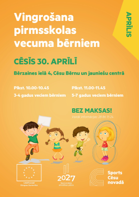 Cēsu Bērnu un jauniešu centrā notiks vispārējās fiziskās sagatavotības nodarbības pirmsskolas vecuma bērniem. Tās būs sadalītas vecuma grupās – bērniem no 3 līdz 4 gadiem un bērniem no 5 līdz 7 gadiem. Nodarbībās tiks attīstītas kustību prasmes, līdzsvars un vispārējā fiziskā sagatavotība, pielāgota bērnu vecumam un attīstības līmenim.