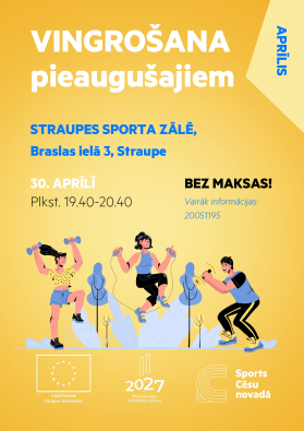 Pieaugušajiem būs iespēja piedalīties vingrošanas nodarbībās Cēsīs, Līgatnē, Straupē un Jaunpiebalgā. Nodarbības vadīs speciālisti, un tās būs piemērotas gan iesācējiem, gan tiem, kuri regulāri nodarbojas ar fiziskām aktivitātēm. Precīzs grafiks tiks publicēts pašvaldības un "Sports Cēsu novadā" sociālo tīklu kontos.