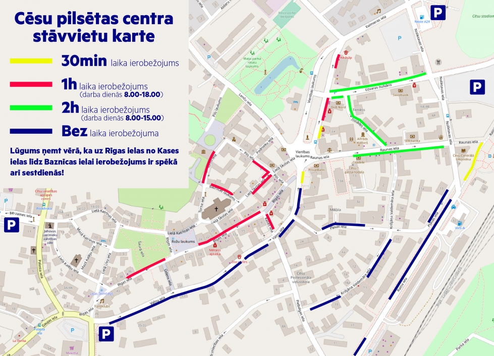 Lasīt vairākCēsu pilsētā visas automašīnu stāvvietas ir bez maksas, taču daudzviet noteikts automašīnu stāvēšanas laika ierobežojums.