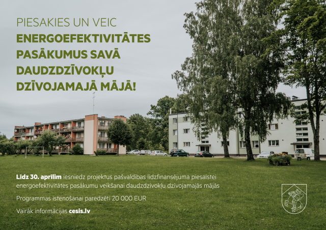 Lasīt vairākCēsu novada pašvaldība aicina daudzdzīvokļu dzīvojamo māju dzīvokļu īpašniekus, biedrības un apsaimniekotājus līdz 2026. gada 30. aprīlim iesniegt projektu pieteikumus pašvaldības līdzfinansējuma saņemšanai energoefektivitātes pasākumu īstenošanai.