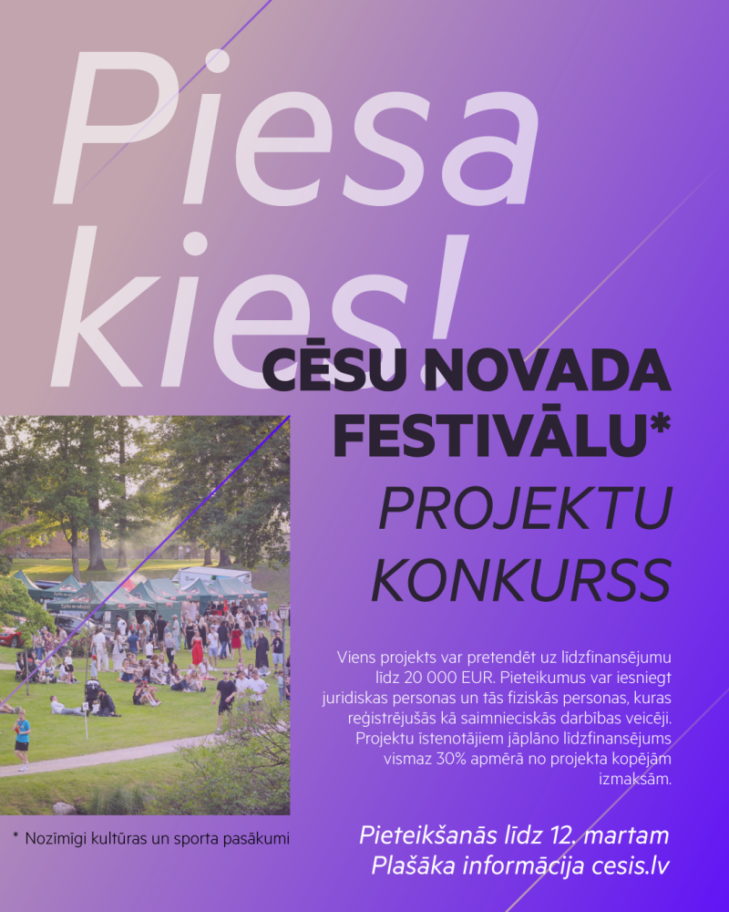 Cēsu novada pašvaldības iestāde "Kultūras pārvalde" 20. februārī izsludinājusi Cēsu novada festivālu, sabiedriski nozīmīgu kultūras un sporta pasākumu projektu konkursu.
