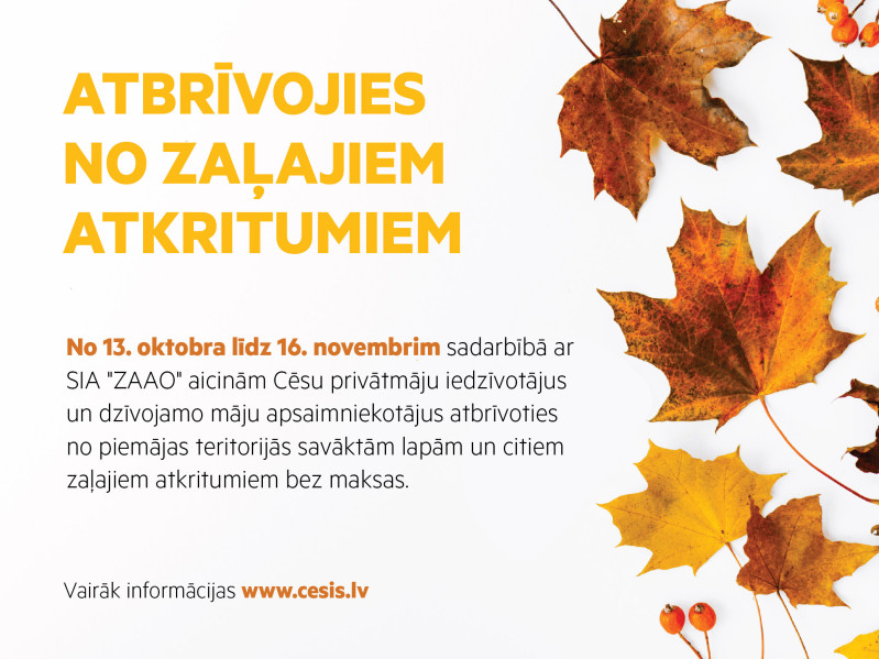 Lasīt vairākCēsu novada pašvaldība sadarbībā ar SIA “ZAAO” no 13. oktobra līdz 16. novembrim iedzīvotājiem piedāvā iespēju bez maksas nodot zaļos atkritumus. Akcijas laikā zaļos atkritumus varēs gan nodot EKO laukumā Lapsu ielā 19, Cēsīs, gan pieteikt to izvešanu no savas adreses, ja tā iekļauta pašvaldības apstiprinātajā adrešu sarakstā.