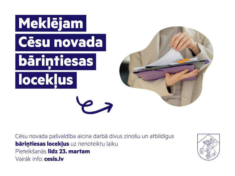 CV, pieteikuma vēstuli iesniegt elektroniski, sūtot uz e-pastu vakances@cesunovads.lv ar norādi “Bāriņtiesas loceklis” līdz 2026. gada 23. martam (ieskaitot).