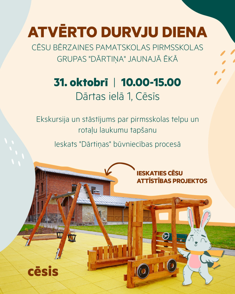 Pirmais atvērto durvju cikla pasākums notiks 31. oktobrī no plkst. 10.00 līdz plkst. 15.00, kad ikviens aicināts apmeklēt Cēsu Bērzaines pamatskolas pirmsskolas grupu "Dārtiņa" Dārtas ielā 1, Cēsīs.