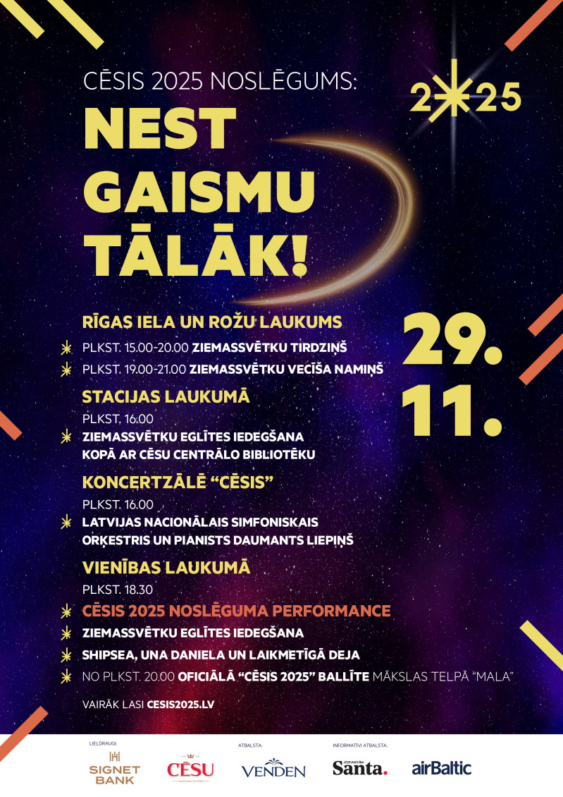 Sestdien, 29. novembrī, Cēsīs noslēgsim Latvijas kultūras galvaspilsētas gadu ar notikumu “Nest gaismu tālāk!”, aicinot pilsētas iedzīvotājus un viesus kopīgi iedegt gaismu, kas mūs pavadījusi visa gada garumā. Šī diena būs kā sirsnīgs atskats uz paveikto un svinīgs punkts kultūras piepildītam gadam.