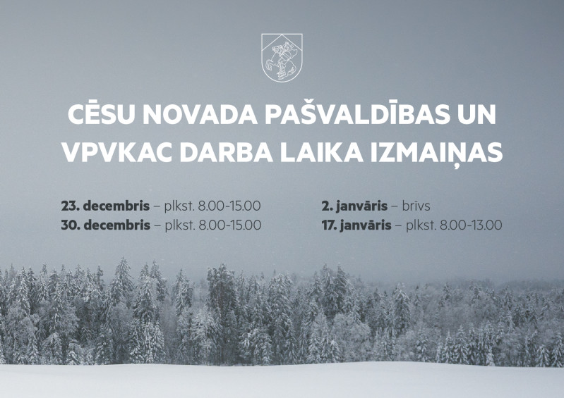 Informējam, ka svētku laikā mainīts Cēsu novada pašvaldības un Valsts un pašvaldību vienotā klientu apkalpošanas centra (VPVKAC) darba laiks: