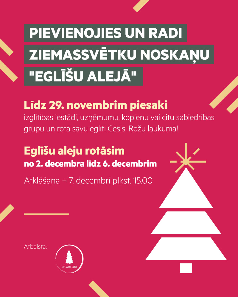 Cēsīs atkal iemirdzēsies īpaša svētku tradīcija – Rožu laukumā arī šogad turpināsim veidot "Eglīšu aleju"! Svētku noskaņas radīšanā aicinām piedalīties Cēsu novada izglītības iestādes, uzņēmumus, kopienas, nevalstiskās organizācijas un ikvienu citu kolektīvu.