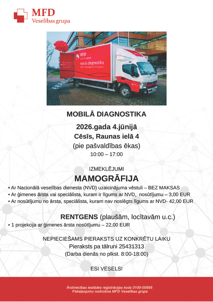 Cēsīs, Raunas ielā 4 (pie pašvaldības ēkas) - 4. jūnijā pieejams MFD mobilais mamogrāfs