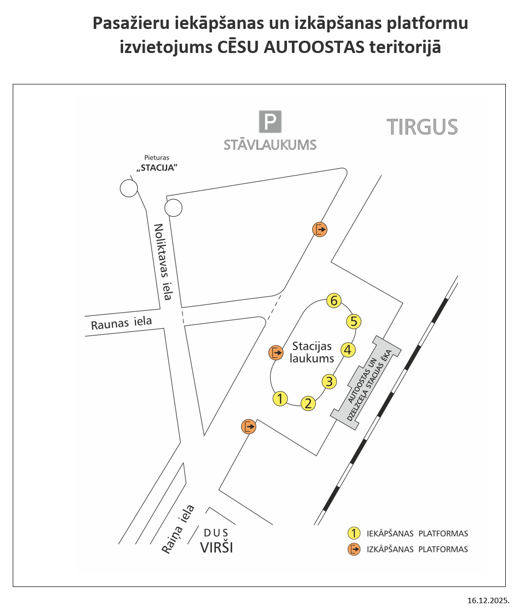 Cēsīs pabeigti galvenie Stacijas laukuma teritorijas rekonstrukcijas darbi. No 16. decembra plkst. 12.00 AS “CATA” atsāks reisu izpildi un pasažieru apkalpošanu atjaunotajā teritorijā Stacijas laukumā, izmantojot jaunizveidotās iekāpšanas/izkāpšanas platformas.