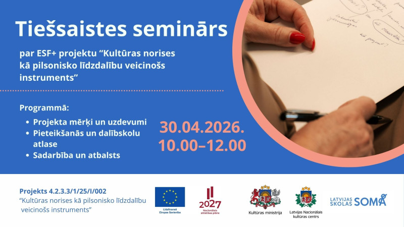 Ceturtdien, 30. aprīlī no plkst. 10.00 līdz plkst. 12.00 notiks informatīvs tiešsaistes seminārs par Eiropas Sociālā fonda Plus (ESF+) projektu “Kultūras norises kā pilsonisko līdzdalību veicinošs instruments”. Vebināru organizē Latvijas Nacionālais kultūras centrs, un tajā aicināti piedalīties gan izglītības jomas pārstāvji, gan ikviens interesents.