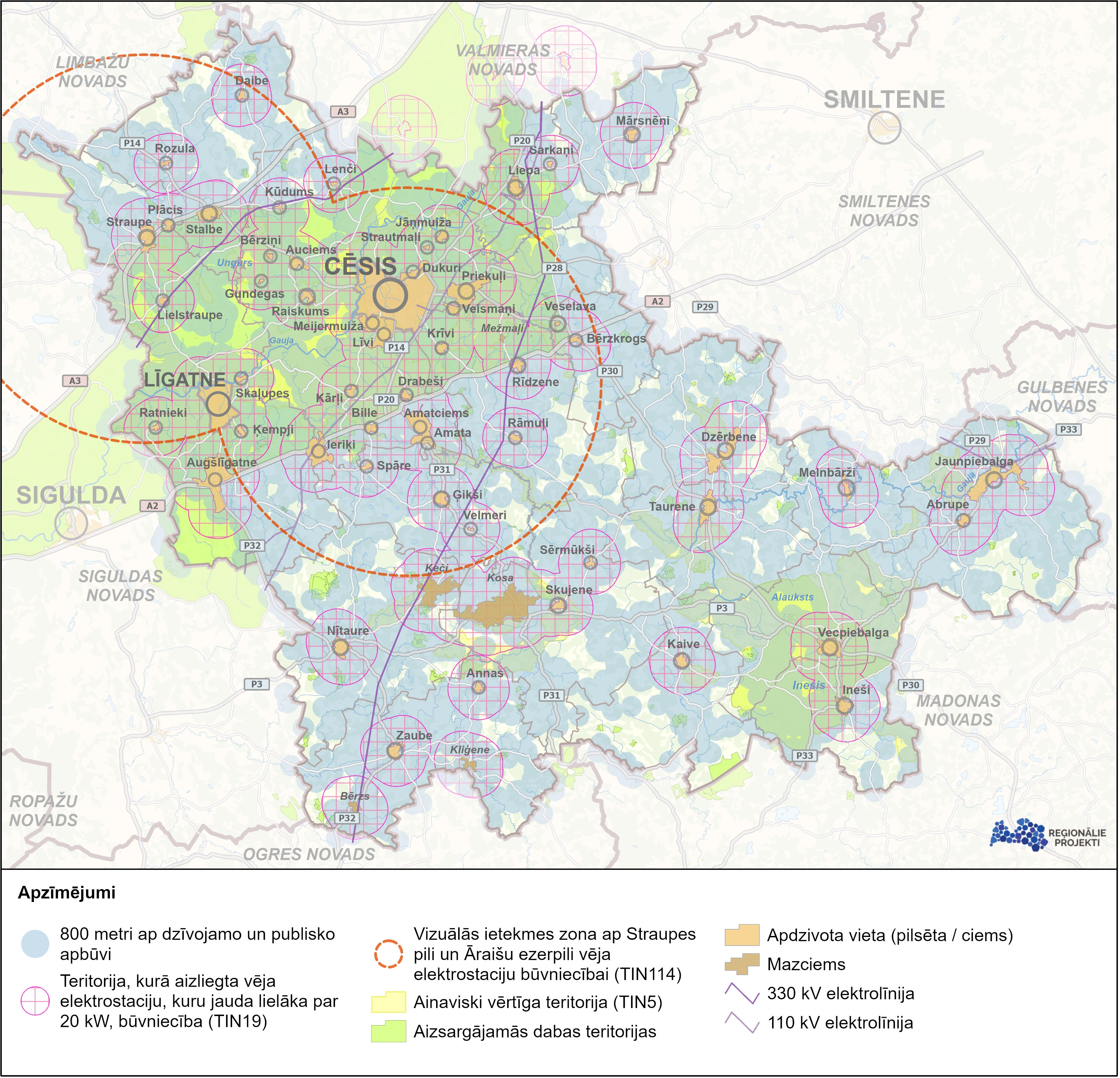 Teritorijas plānojumā noteiktas vairākas teritorijas, kurās vēja parku būvniecība ir aizliegta, piemēram, ainaviski vērtīgajās jeb TIN5 teritorijās, kā arī noteikta īpaša TIN19 teritorija, kurā aizliegta vēja elektrostaciju, kuru jauda lielāka par 20 kW, būvniecība. Šāda teritorija noteikta 2 km buferjoslā ap pilsētām, ciemiem un mazciemiem. Tāpat noteikta īpaša TIN114 teritorija jeb vizuālās ietekmes zona ap Straupes pili un Āraišu ezerpili, kurā, nākotnē plānojot vēja elektrostaciju būvniecības ieceres, attīstītājam būs jānodrošina, ka vēja turbīnas nebūs redzamas no šiem pašvaldībai nozīmīgajiem kultūrvēsturiskajiem un tūrisma objektiem.