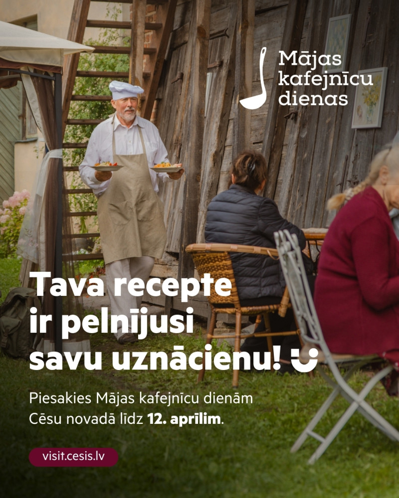 Līdz 12. aprīlim aizpildi anketu un piesakies vasaras gardākajam notikumam Cēsu novadā! Šī ir Tava iespēja uz vienu nogali pārvērst savu pagalmu, dārzu vai saimniecību mājīgākajā kafejnīcā. Ļaujies kulinārajam radošumam, radi noskaņu, dalies ar stāstiem un iepriecini gan kaimiņus, gan novada viesus.