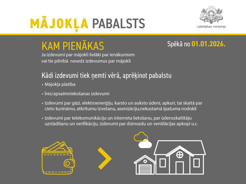 Ņemot vērā būtisko mājokļa uzturēšanas izmaksu pieaugumu 2026. gada janvārī un februārī, Latvijas valdība ir atbalstījusi grozījumus, kas paredz mājokļa pabalsta aprēķinā piemērojamo koeficientu palielināšanu no 2026. gada 1. janvāra līdz 30. aprīlim.
