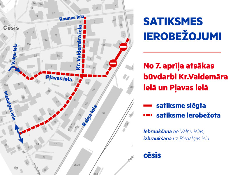 Pēc Lieldienām, no 7. aprīļa, pēc tehnoloģiskā pārtraukuma atsāksies būvdarbi Kr. Valdemāra un Pļavas ielās, Cēsīs.