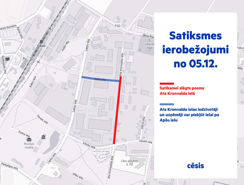 Sākot no 5. decembra Ata Kronvalda iela posmā no iebrauktuves CATA teritorijā līdz Vaives ielai būs slēgta satiksmei. Ielas iedzīvotājiem un uzņēmumiem piekļuve pie īpašumiem tiks nodrošināta. Lai piekļūtu būvdarbu posmam, jāizmanto Apšu iela.