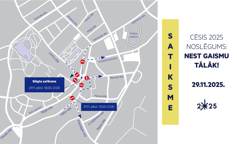 Pasākuma norises laikā gaidāmas satiksmes izmaiņas Rīgas ielā un Vienības laukumā, Cēsīs, tādēļ aicinām plānot pārvietošanās maršrutus laicīgi.