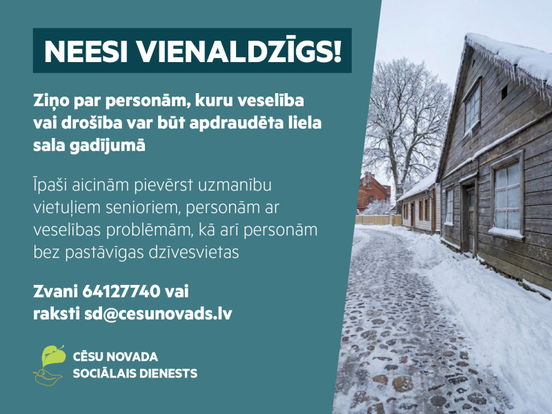 Ja Jūsu rīcībā ir informācija par personām, kuru veselība vai drošība stipra sala laikā var būt apdraudēta, lūdzam par to informēt Cēsu novada Sociālo dienestu: