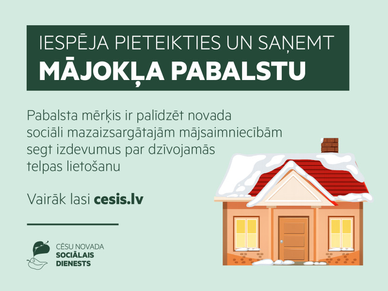 Ja apkures, elektrības vai īres maksājumi kļūst par pārāk lielu slogu un ienākumi tos pilnībā nesedz, Cēsu novada iedzīvotāji var saņemt mājokļa pabalstu. Cēsu novada Sociālais dienests palīdz mājsaimniecībām ar zemiem ienākumiem segt ar mājokli saistītos izdevumus, lai nodrošinātu drošu un stabilu dzīves vidi.