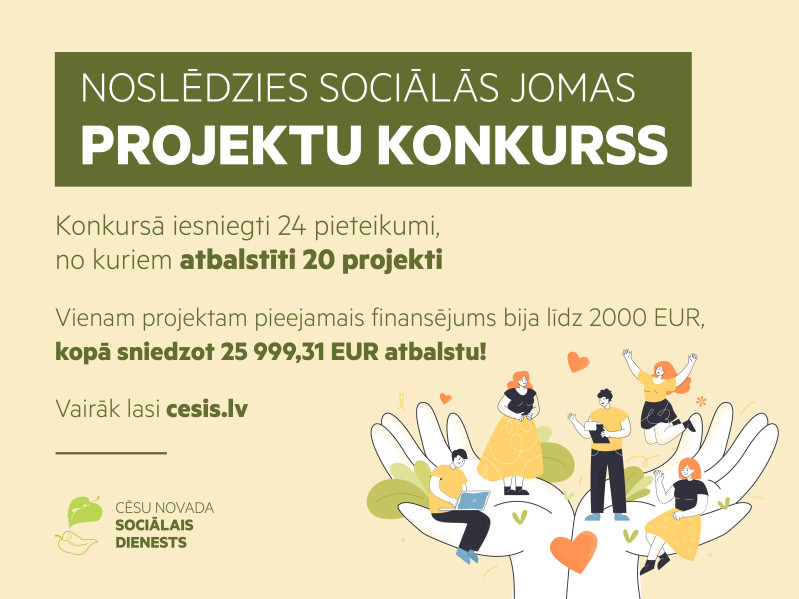 Noslēgusies Cēsu novada Sociālā dienesta organizētā sociālās jomas projektu konkursa pieteikumu izvērtēšana. Šogad konkursā saņemti 24 projektu pieteikumi, no kuriem atbalstīti 20, kopumā piešķirot līdzfinansējumu 25 999,31 EUR apmērā.