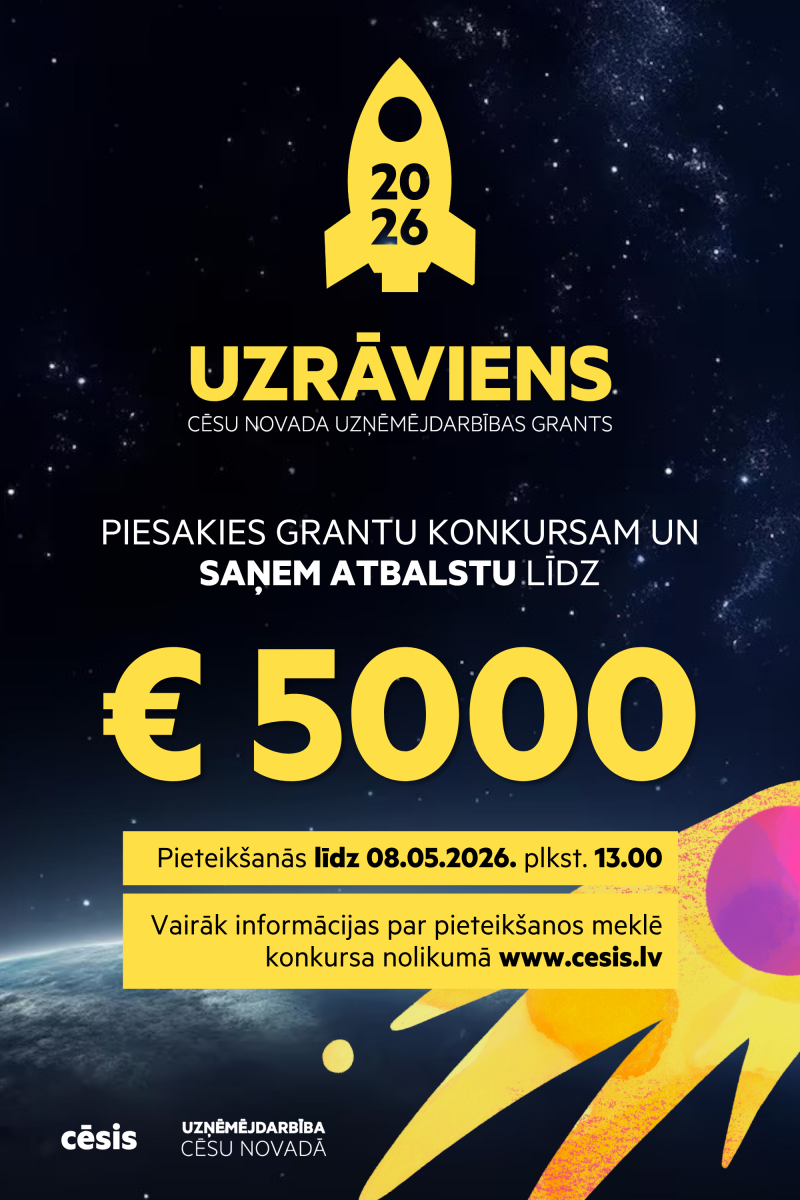Aicinām biznesa ideju autorus un esošos uzņēmējus piedalīties grantu konkursā "Uzrāviens 2026", lai saņemtu finansiālu atbalstu līdz pat 5000 EUR savas ieceres īstenošanai.