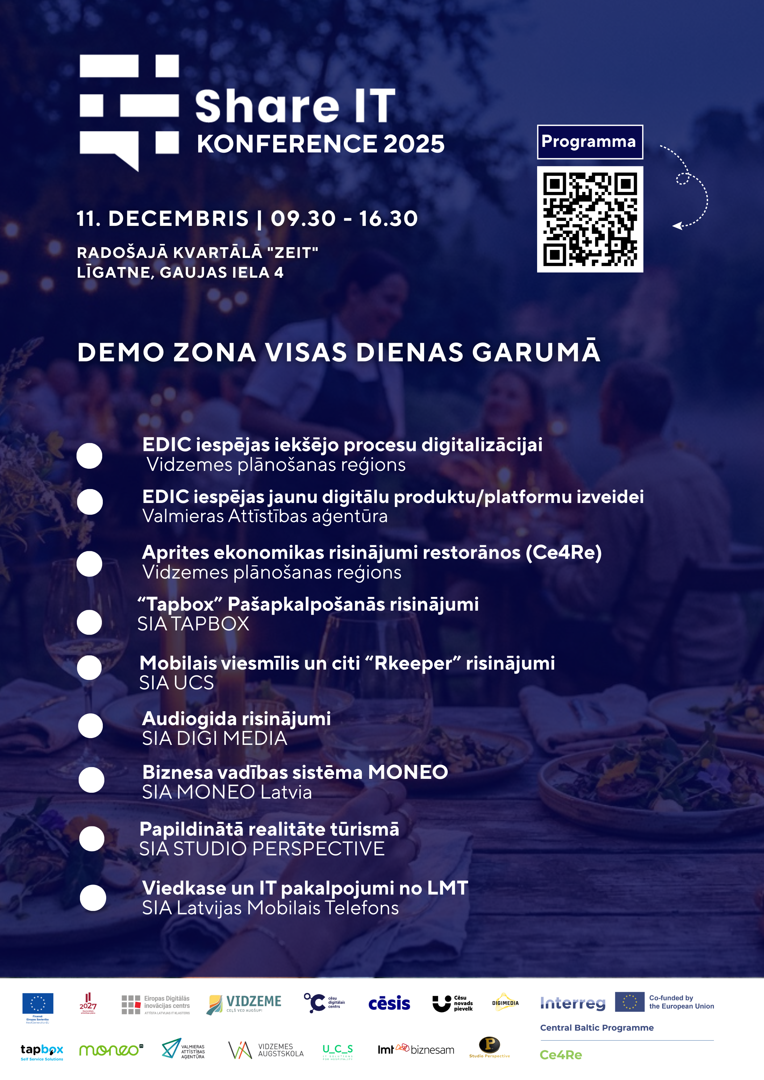 Ceturtdien, 11. decembrī, plkst. 10.00 Līgatnē, radošajā kvartālā “Zeit”, Gaujas ielā 4, notiks konference “ShareIT 2025: tūrisms un viesmīlība”, ko organizē Cēsu digitālais centrs, Cēsu novada uzņēmējdarbības nodaļa sadarbībā ar EDIC Vidzemes reģiona kontaktpunktu. Pasākums paredzēts tūrisma un viesmīlības nozares uzņēmumiem, naktsmītnēm, ēdināšanas uzņēmumiem, kā arī citiem pakalpojumu sniedzējiem, kuri vēlas attīstīt un pilnveidot digitalizācijas procesus savā darbībā. Konferences mērķis ir iepazīstināt uzņēmumus ar iespējām izmantot digitālos rīkus un tehnoloģijas, lai uzlabotu klientu pieredzi, uzņēmuma efektivitāti un ilgtspēju. Dalībnieki uzzinās, kā digitālie risinājumi, datu analītika un mākslīgais intelekts palīdz optimizēt resursus, uzlabot pārdošanas rezultātus, automatizēt ikdienas procesus un palielināt konkurētspēju gan vietējā, gan starptautiskajā tirgū.