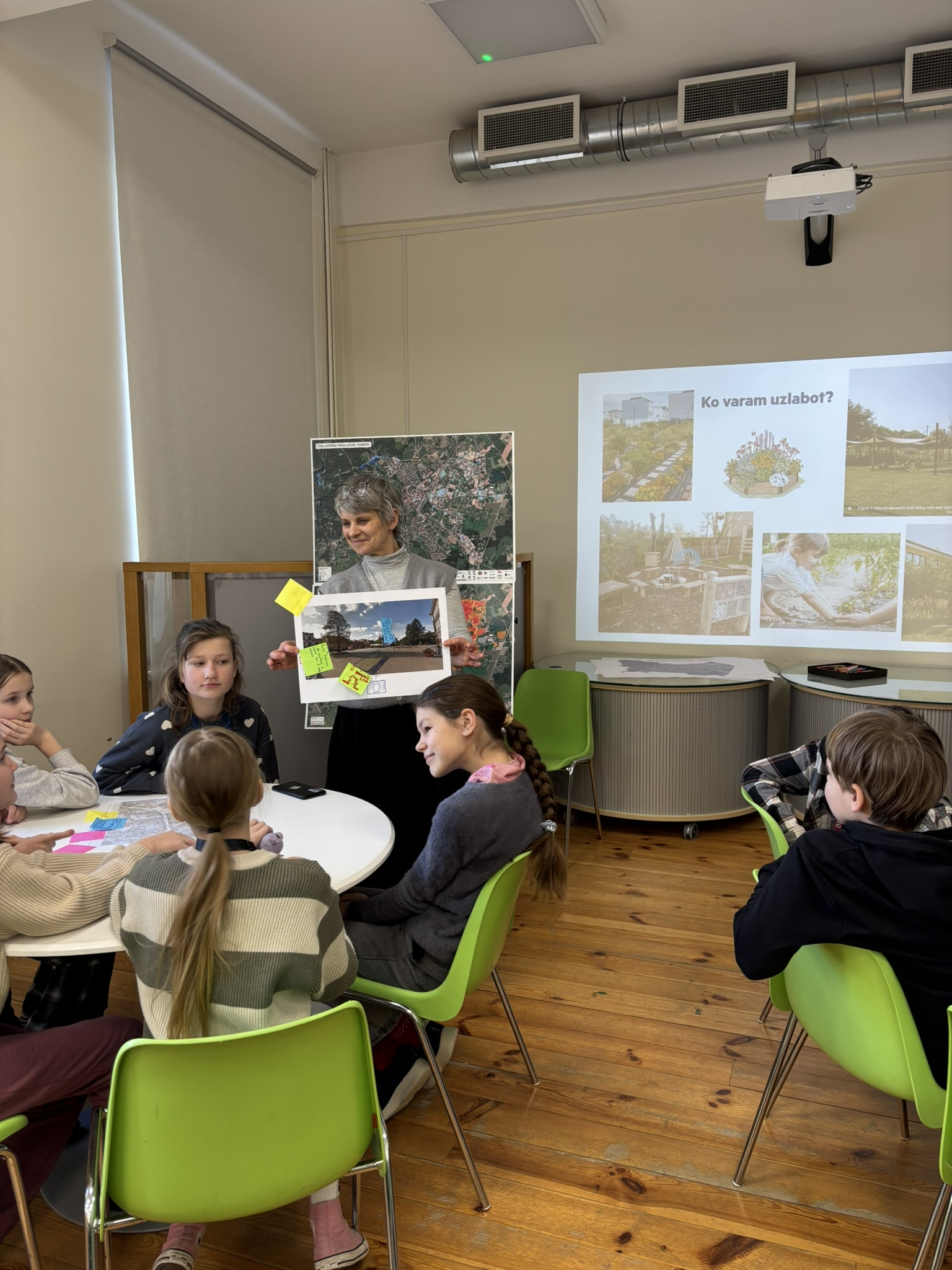Katra grupa savas idejas prezentēja pārējiem, argumentējot izvēlētos risinājumus un diskutējot par to ietekmi uz vidi un pilsētas attīstību.
