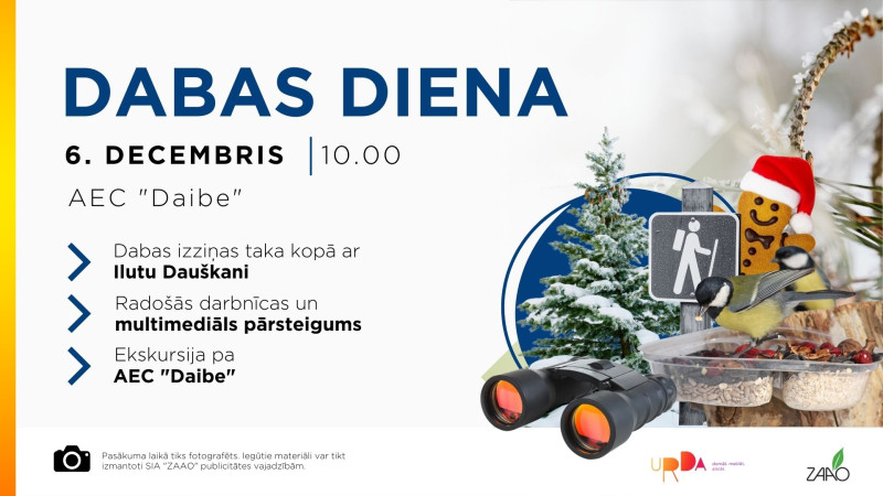 Sestdien, 6. decembrī, no plkst. 10.00 līdz 14.00 SIA “ZAAO” Dabas un tehnoloģiju parkā “URDA” norisināsies ģimeņu iecienītais pasākums – Dabas diena. Pasākums sezonāli un tematiski ļauj iepazīt vidi sev apkārt, aicina darboties radoši un apritīgi, kā arī sniedz iespēju ielūkoties atkritumu apsaimniekošanas aizkulisēs, dodoties ekskursijā pa Aprites ekonomikas centru “Daibe”.