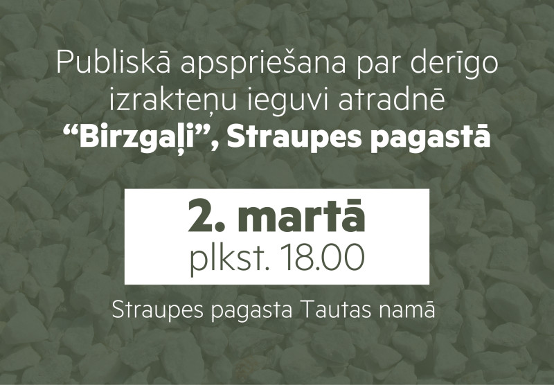 Šī gada 2. martā plkst. 18.00 Straupes pagasta Tautas namā ("Tautas nams", Plācis, Straupes pagasts) notiks publiskā apspriešana – informatīva sanāksme par plānoto derīgo izrakteņu ieguvi atradnē “Birzgaļi”. Uz tikšanos aicināti visi interesenti, īpaši tuvākās apkārtnes iedzīvotāji.
