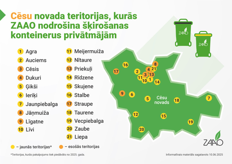 SIA “ZAAO” (ZAAO) turpinot attīstīt modernu, iedzīvotājiem ērtu atkritumu apsaimniekošanas sistēmu, tai skaitā pilnveidojot šķirošanas pakalpojumu pieejamību, paplašina teritoriju, kurā pieejams individuāli dalīti vāktu atkritumu apsaimniekošanas bezmaksas pakalpojums privātmājām. Šķirot pie privātmājas namdurvīm Cēsu novadā iespējams Cēsu pilsētas teritorijā dzīvojošajiem, kā arī privātmāju saimniekiem Agrā, Auciemā, Dukuros, Ģikšos, Ieriķos, Jaunpiebalgā, Jāņmuižā, Liepā, Līgatnē, Līvos, Meijermuižā, Nītaurē, Priekuļos, Rīdzenē, Skujenē, Stalbē, Straupē, Taurenē, Vecpiebalgā un Zaubē!